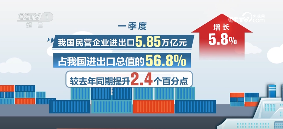 一季度,我国平易近营企业进出口5。85万亿元,增加5。8%,占我国进出口总值的56。8%,同期,外商投资企业进出口2。99万亿元,增加0。4%,占进出口总值的29%。
